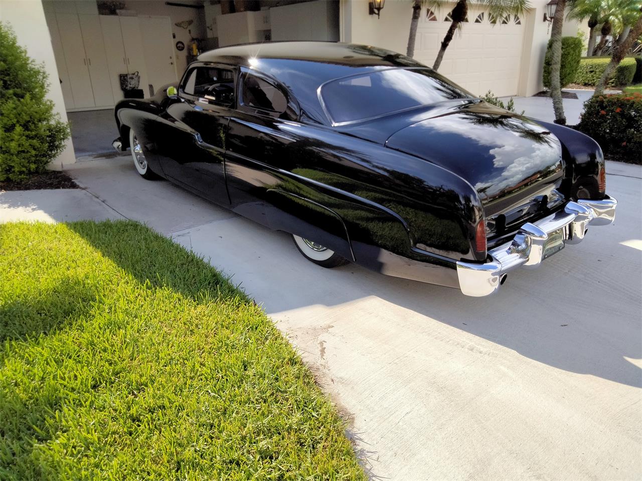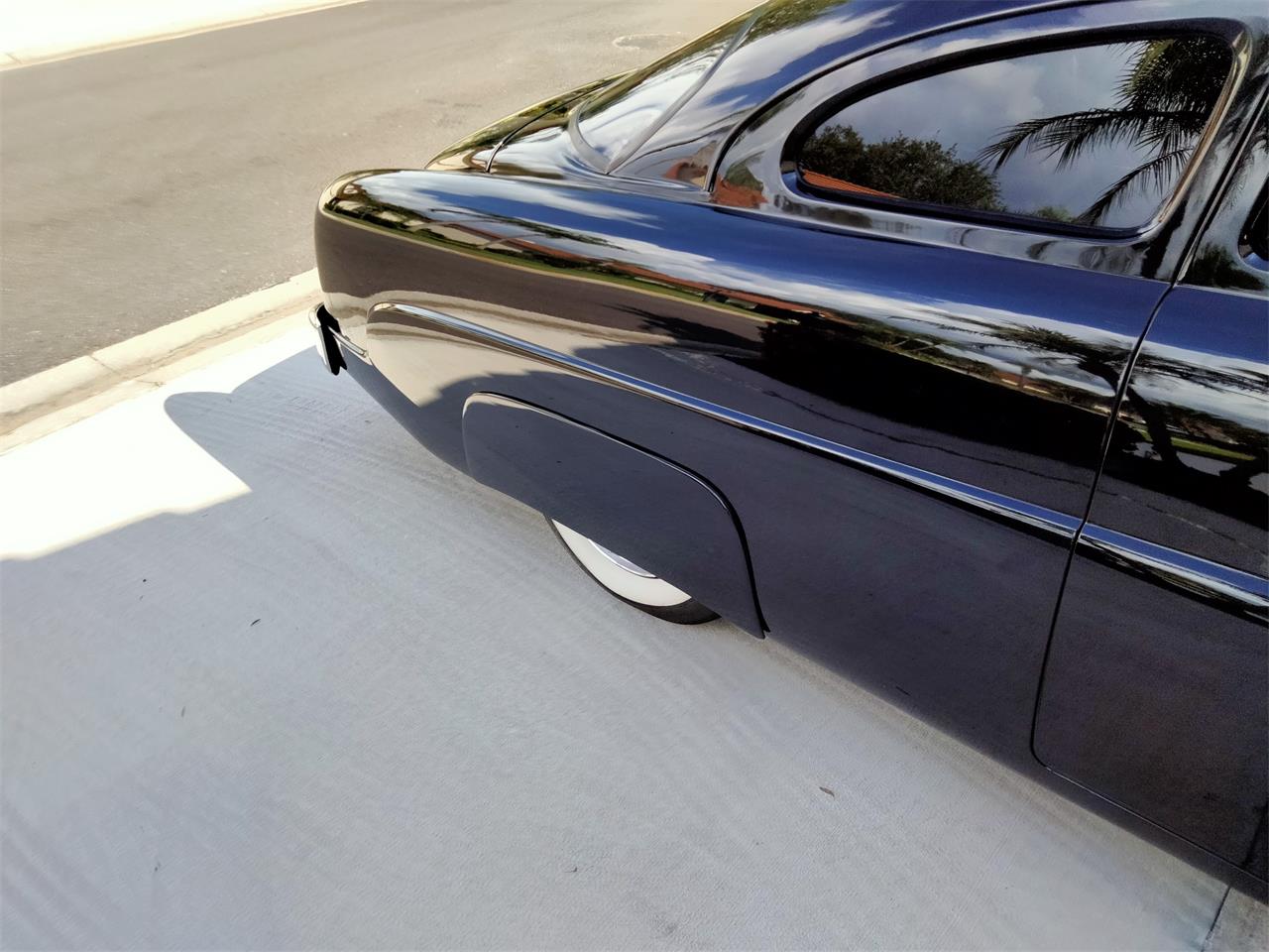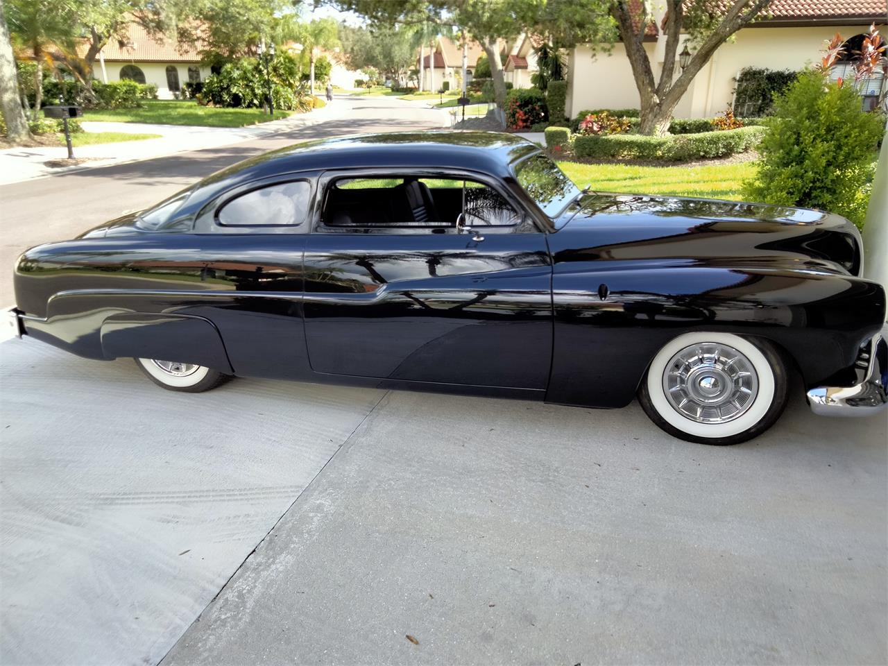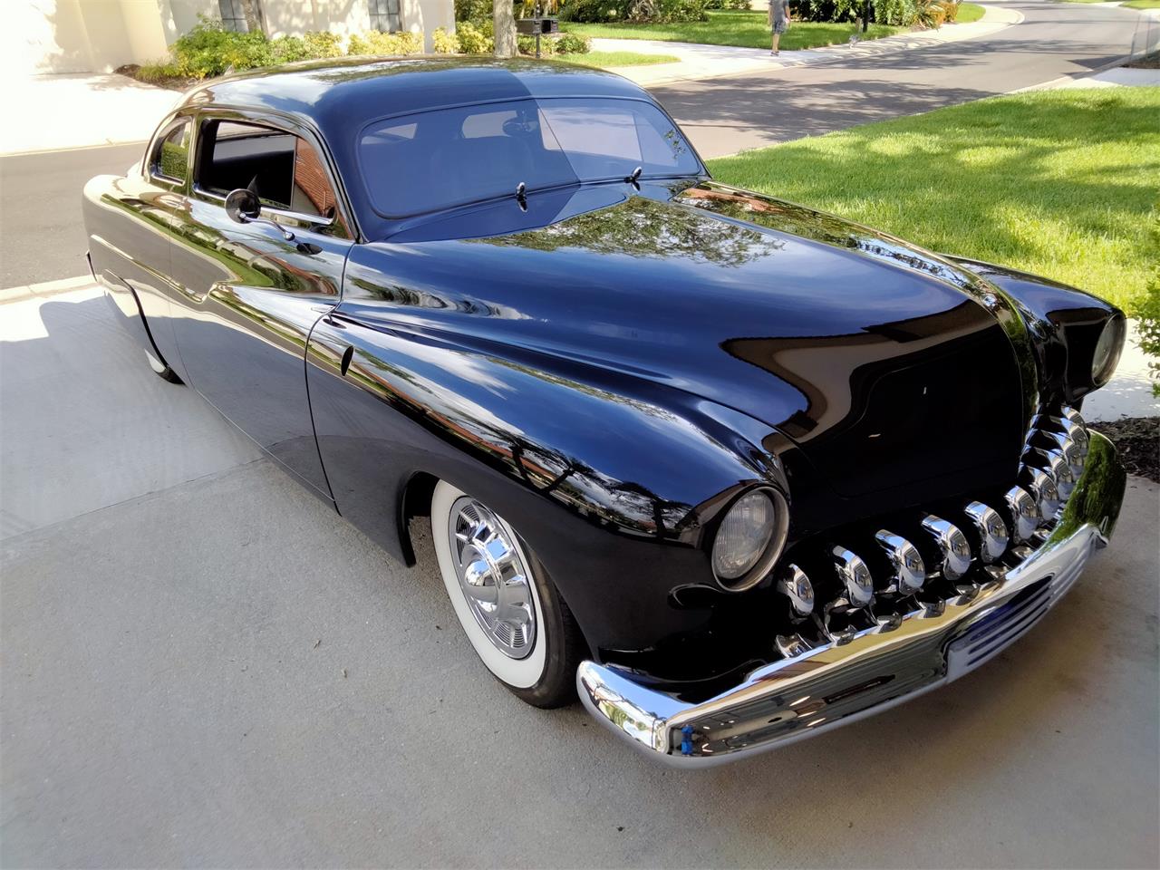 1951 Mercury lead sled, built by Harts Hot Rods in Brea, Ca for 5 time NHRA drag racer Joe Amato, complete frame off build with extensive body work, Chopped top with full size back window, pancake hood with a one piece front end with beautiful 1953 Desoto big tooth grill. Shaved and decked with electric doors and all side trim window revels removed. Custom front and rear bumpers center sections cut and replaced, all chrome replated and spotless. Built on a custom frame with four wheel coil overs and disk brakes, fuel cell, four bar 9″ Ford, topped of with an electronic E brake system (see pictures of frame). This 51 is powered by a 2021 383/450hp Al head, roller rockers, stroker motor brand new by Blue Print, not a rebuilt. Topped off with 3 new Stromberg carbs built by Speedway motors in the US with its custom fuel management system and linkage, electronic ignition with mini starter, Hedman headers, PS, PB, PW, AC and 140 amp alternator using a Holly front runner system. super neat appearance under the hood as it was made to look like a Olds rocket 88, period correct for the 60’s Hot Rodders, backed by a monster 4L80e electronic trans by TCI.