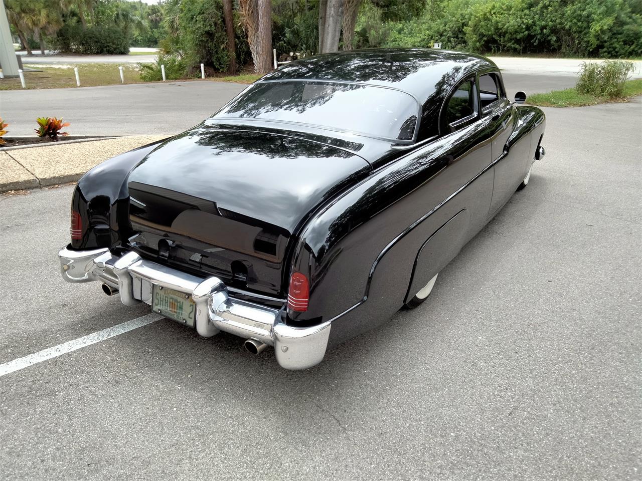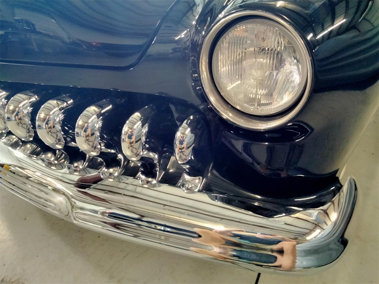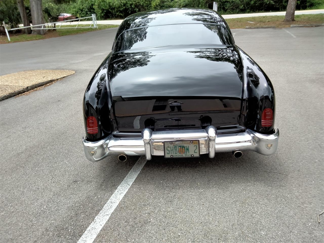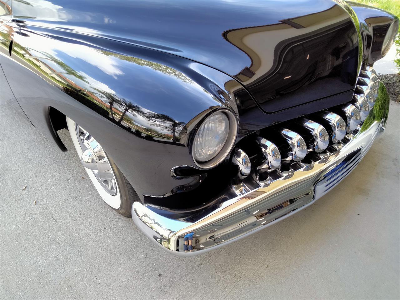 1951 Mercury lead sled, built by Harts Hot Rods in Brea, Ca for 5 time NHRA drag racer Joe Amato, complete frame off build with extensive body work, Chopped top with full size back window, pancake hood with a one piece front end with beautiful 1953 Desoto big tooth grill. Shaved and decked with electric doors and all side trim window revels removed. Custom front and rear bumpers center sections cut and replaced, all chrome replated and spotless. Built on a custom frame with four wheel coil overs and disk brakes, fuel cell, four bar 9″ Ford, topped of with an electronic E brake system (see pictures of frame). This 51 is powered by a 2021 383/450hp Al head, roller rockers, stroker motor brand new by Blue Print, not a rebuilt. Topped off with 3 new Stromberg carbs built by Speedway motors in the US with its custom fuel management system and linkage, electronic ignition with mini starter, Hedman headers, PS, PB, PW, AC and 140 amp alternator using a Holly front runner system. super neat appearance under the hood as it was made to look like a Olds rocket 88, period correct for the 60’s Hot Rodders, backed by a monster 4L80e electronic trans by TCI.