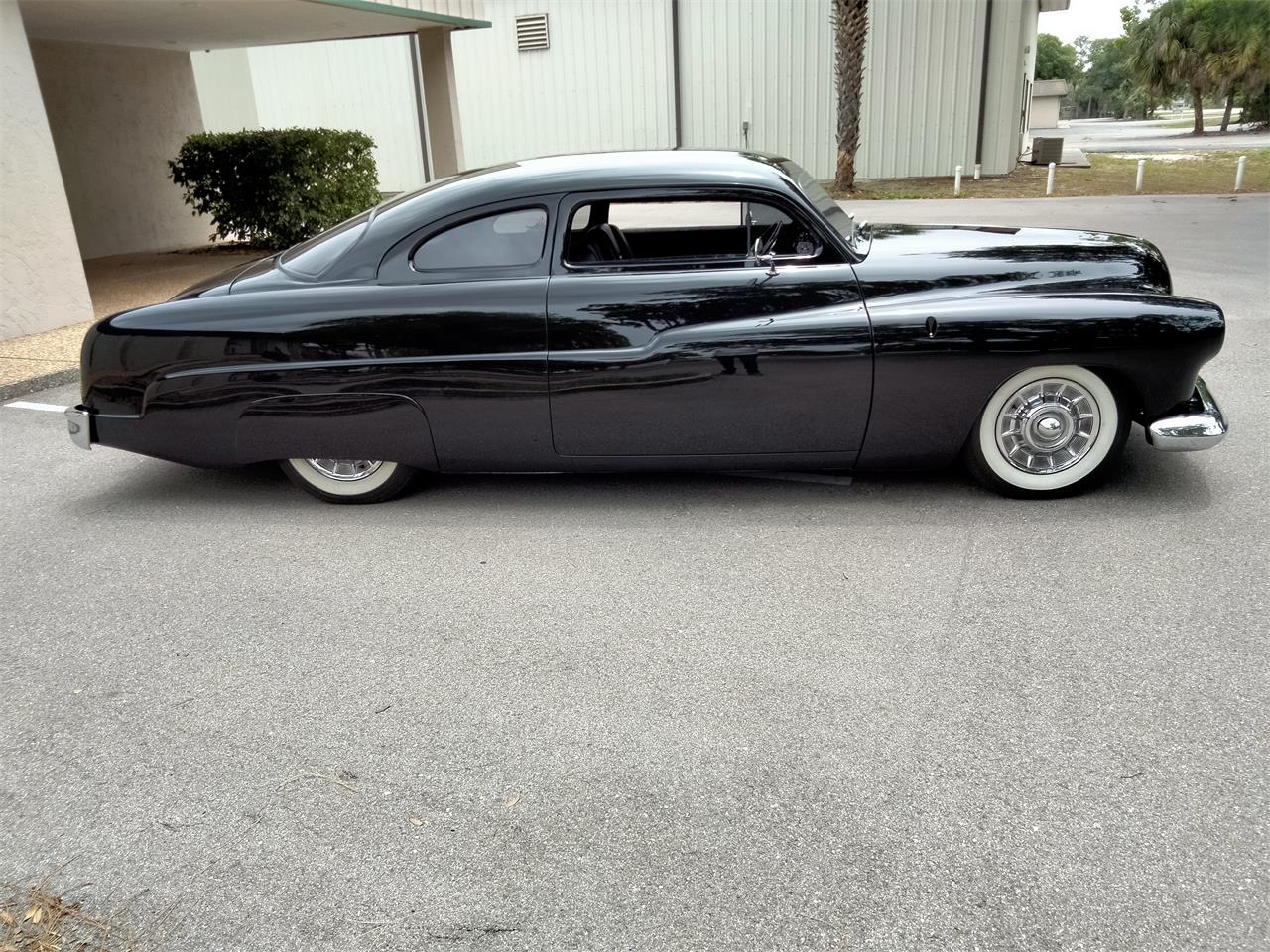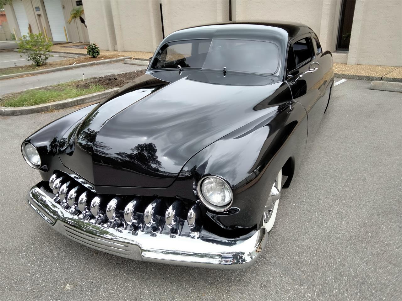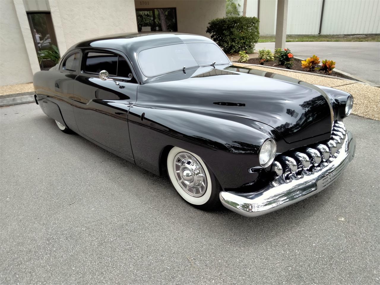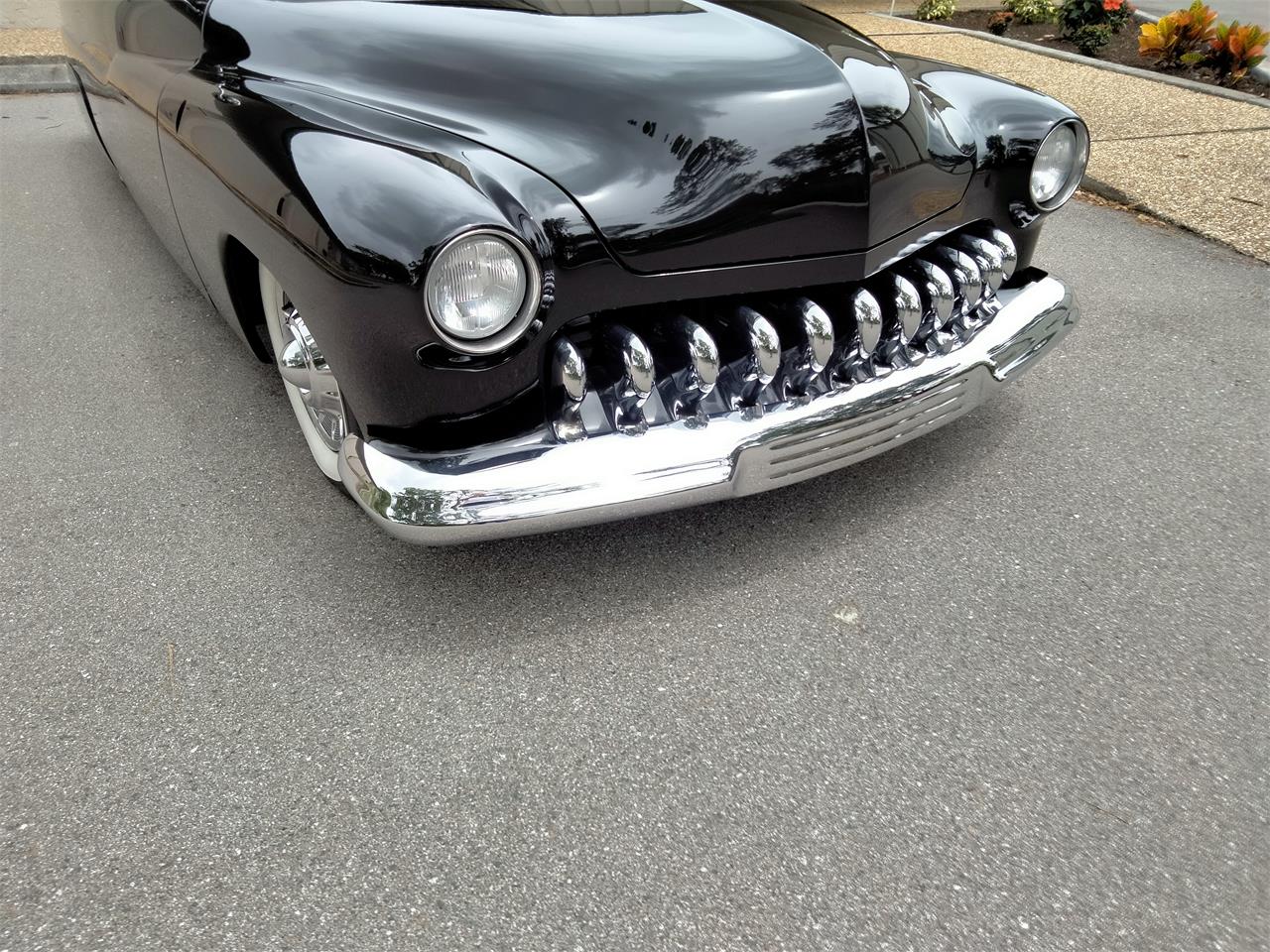 1951 Mercury lead sled, built by Harts Hot Rods in Brea, Ca for 5 time NHRA drag racer Joe Amato, complete frame off build with extensive body work, Chopped top with full size back window, pancake hood with a one piece front end with beautiful 1953 Desoto big tooth grill. Shaved and decked with electric doors and all side trim window revels removed. Custom front and rear bumpers center sections cut and replaced, all chrome replated and spotless. Built on a custom frame with four wheel coil overs and disk brakes, fuel cell, four bar 9″ Ford, topped of with an electronic E brake system (see pictures of frame). This 51 is powered by a 2021 383/450hp Al head, roller rockers, stroker motor brand new by Blue Print, not a rebuilt. Topped off with 3 new Stromberg carbs built by Speedway motors in the US with its custom fuel management system and linkage, electronic ignition with mini starter, Hedman headers, PS, PB, PW, AC and 140 amp alternator using a Holly front runner system. super neat appearance under the hood as it was made to look like a Olds rocket 88, period correct for the 60’s Hot Rodders, backed by a monster 4L80e electronic trans by TCI.