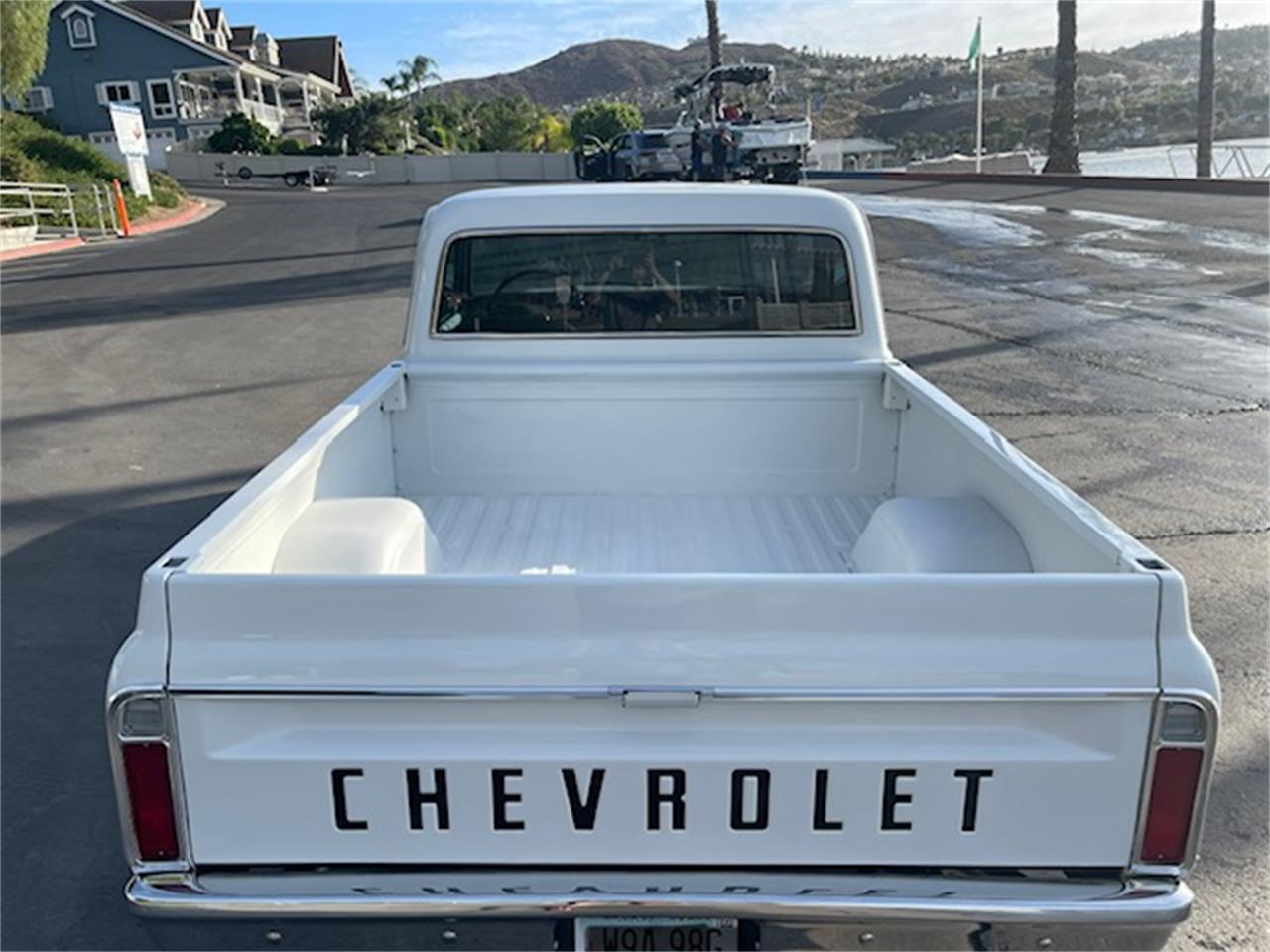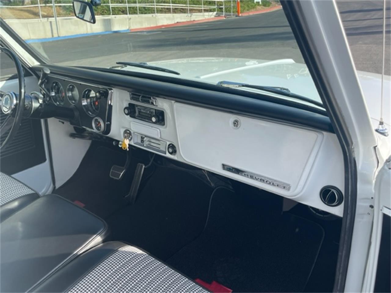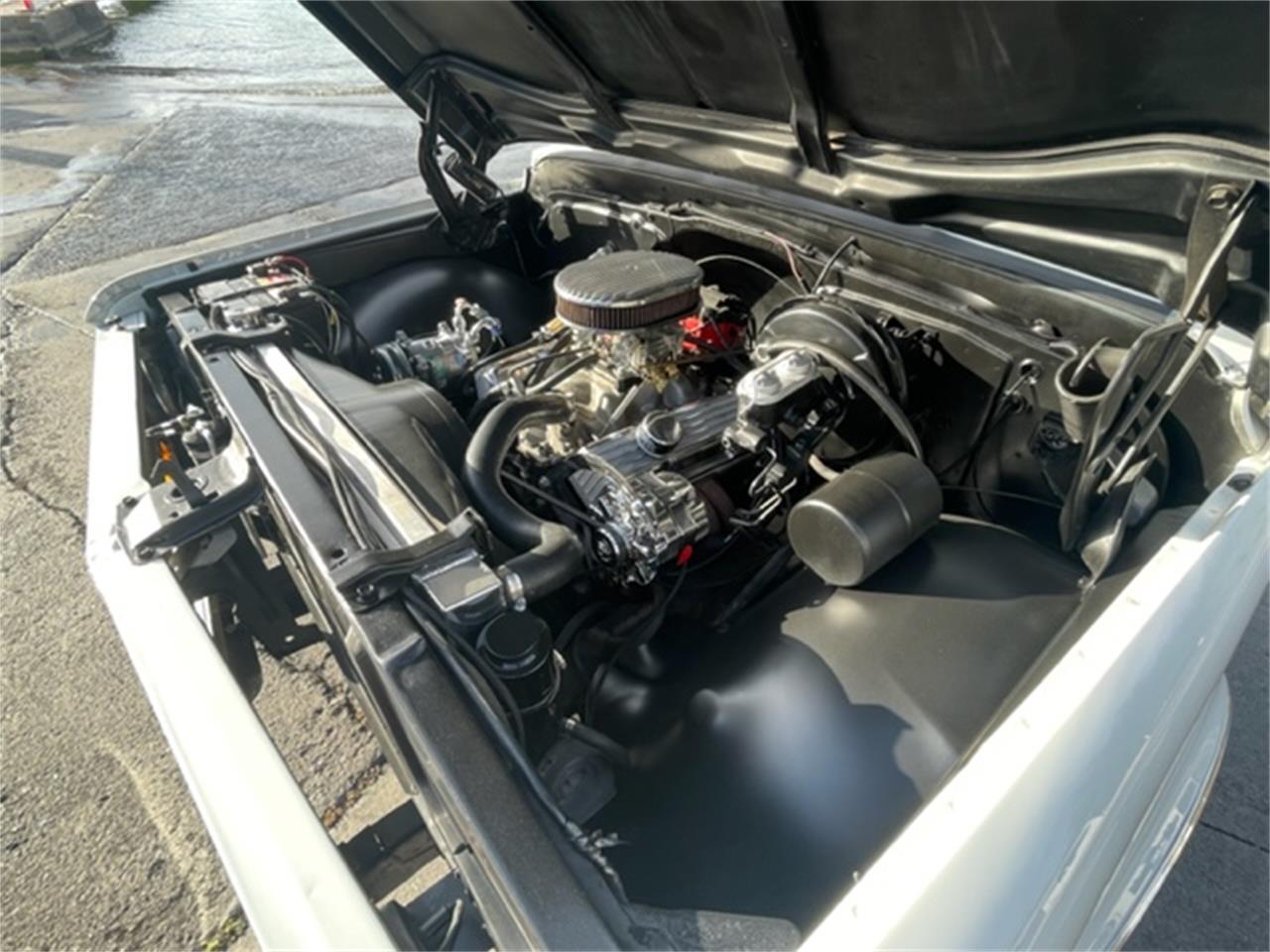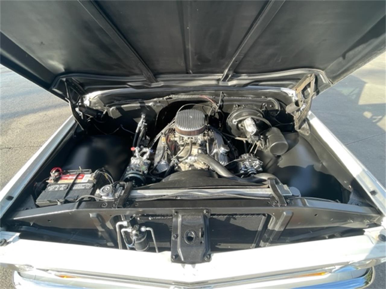Small Block 350ci with a healthy cam with 3 core aluminum radiator (truck runs very cool), Billet specialties Air cleaner and valve covers, Headers to flow master 40 series, power brakes, Hi output chrome alternator, Vintage AC (very cold) and a built TH350 trans.